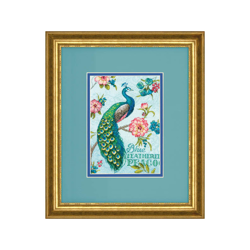 Dimensions, kit The peacock (art. DIM65146). Dimensions: 12.5 x 17.5 cm. Trame: Aïde 7 pts. Broderie sur aïda blanche, relativement complexe et remplie, avec l'utilisation de 2 à 5 brins pour les points, et parfois un mélange de fils de différentes couleur pour un point, ce qui donne un bel aspect de profondeur de l'image.