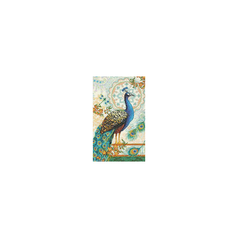 Dimensions Gold, kit Royal Peacock (art. DIM35339). Dimensions: 23 x 38 cm. Broderie relativement complexe et remplie, avec l'utilisation de 2 à 5 brins pour les points, et parfois un mélange de fils de différentes couleur pour un point, ce qui donne un bel aspect de profondeur de l'image.